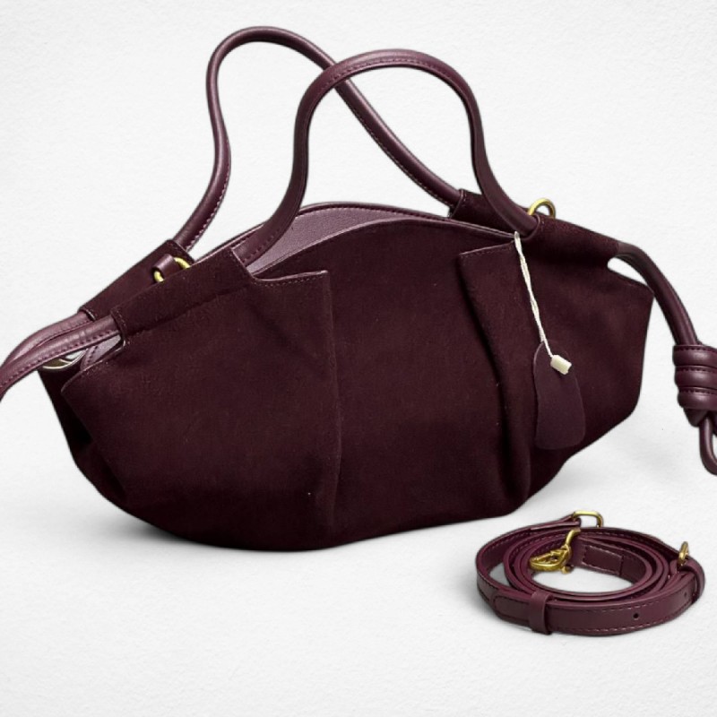 Эта сумка Loewe — настоящий эталон тактильной роскоши и современного дизайна. Модель, известная своим мягким, собранным силуэтом (Dumpling Bag/Flamenco Style), выполнена из высококачественной натуральной замши с контрастными деталями из гладкой кожи.