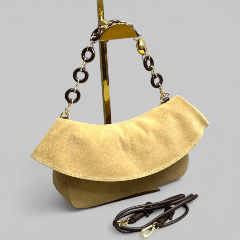 Характеристика Детали Модель Ola Shoulder Bag Бренд Loewe Размер 26х15 см Материал Нат. замша Цвет Жёлтый Фурнитура Золото + полимер. звенья Стиль Hobo на плечо Особенности Клапан-волна, 2 съем. ремня