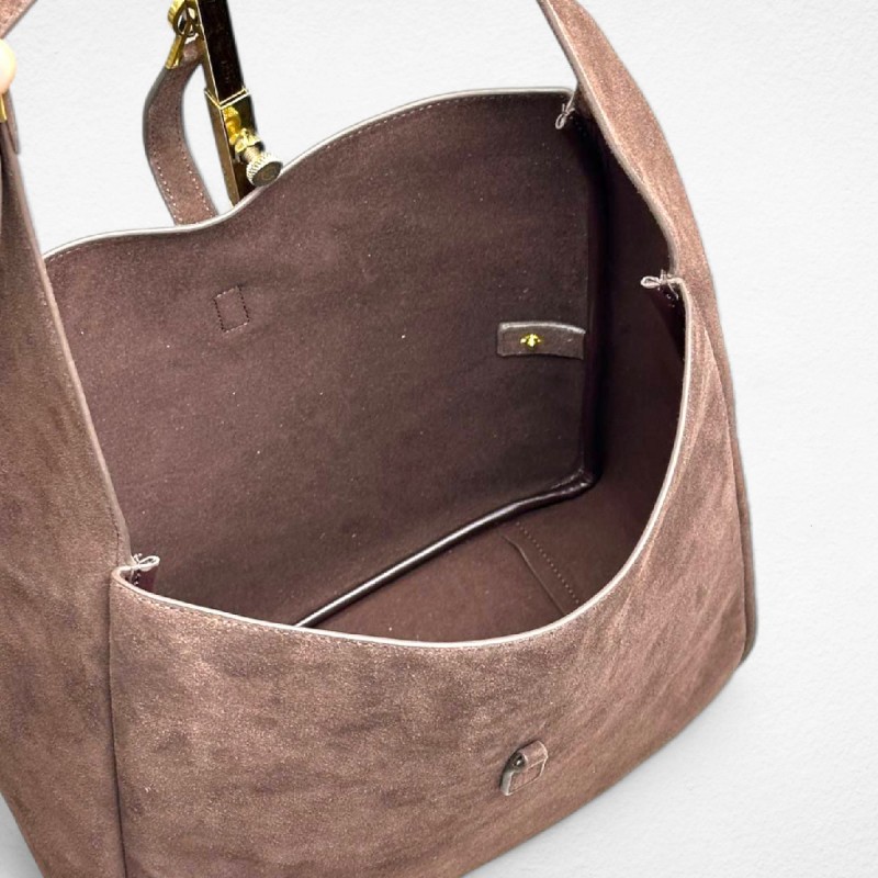 Бархатистая поверхность замши подчеркивает лаконичный дизайн модели. Узнаваемый минимализм формы и элегантная золотистая монограмма YSL, выполняющая роль застежки, делает эту сумку статусной, но при этом непринужденной.