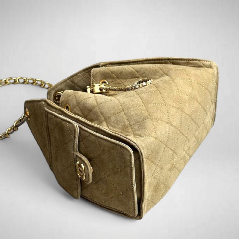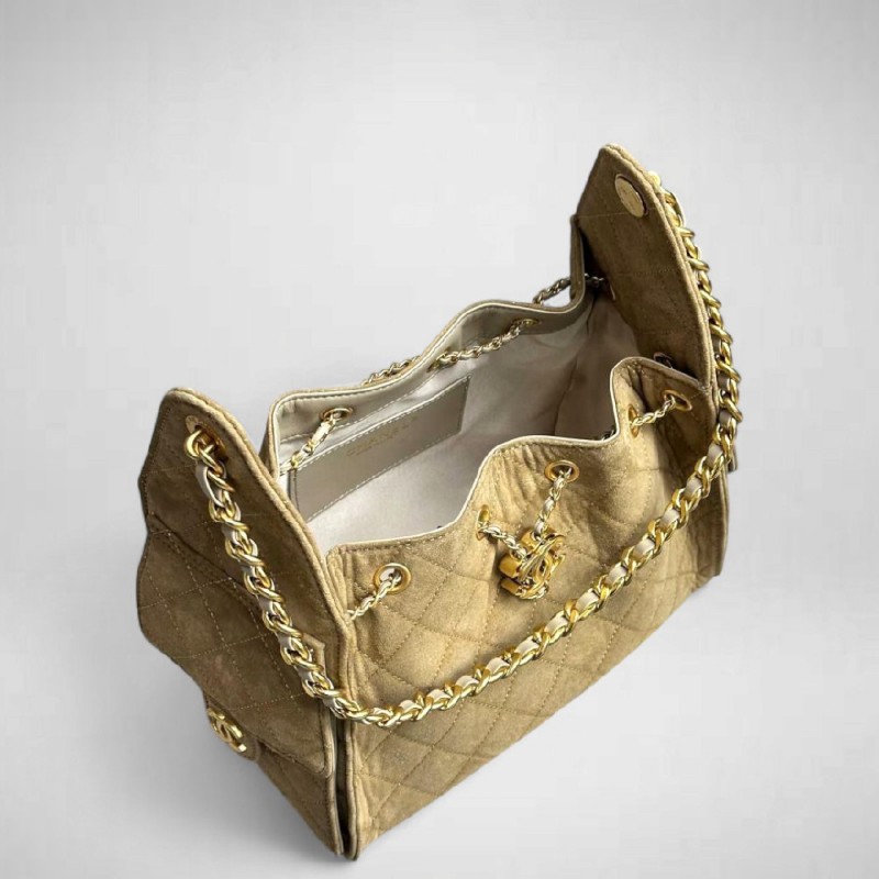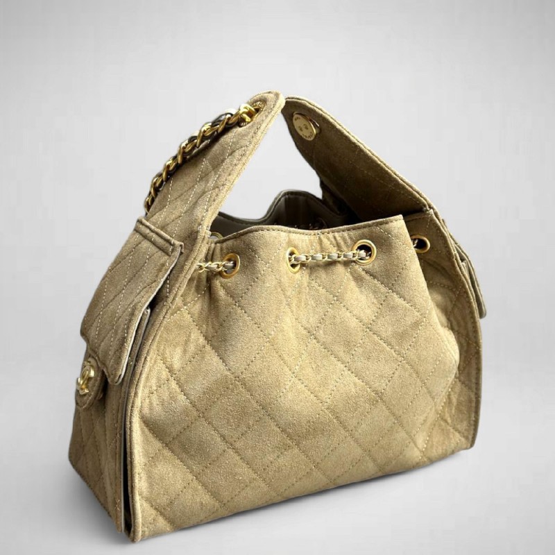 Эта сумка-хобо Chanel Small 25 выполнена из кожи с фурнитурой цвета античного золота. Она имеет фирменную ромбовидную стежку, два внешних боковых кармана, застёжку на шнурок и один переплетённый плечевой ремень из кожи цвета античного золота..